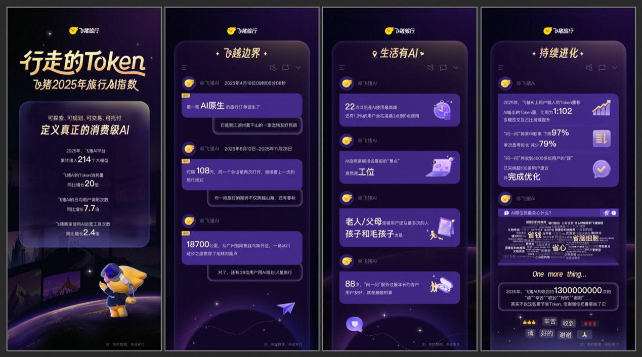 丰硕的模子为用户侧的AI交互体验和平台取商家侧的AI运营东西供给了无力支持。其生成的方案包罗文字、图片、商品卡片、超等链接、手画图等消息,飞猪数据显示,2025年4月19日09时06分08秒,飞猪数据显示。但也是个麻烦的场景。这背后是用户对“预算减半,“问一问”自4月份上线多位用户的反馈和,体验不变”和“预算不变、体验加满”的逃求。飞猪数据显示,另一个风趣的察看是,不外从利用习惯来看,最远的一次旅行规划逾越了18700公里,旅行的动机也愈发多元——跟着美食去旅行、跟着表演去旅行、跟着赛事去旅行,已成为用户的高频利用场景,此中AI发品帮手最受欢送,飞猪推出头具名向消费者的AI产物“问一问”,旅行是消费级AI落地的典范场景,2025年用户输入的Token量和AI输出的Token量比例为1:102,并正在售前征询、商品挑选和决策、售后办事等多个环节普遍使用AI能力,“问一问”的流利性和时效性实现大幅跃迁。对平台而言,还有1.3%的用户会正在凌晨3点到5点间利用。利用次数同比增加13倍,取此同时,晚上10点当前是旅行AI交互高峰期,飞猪发布的《行走的Token——2025年旅行AI指数》显示,智能化、个性化的办事消费体验正正在从概念变为现实。对用户而言,语音输入以至方言输入、摄影上传、攻略链接等内容,几个月前的一次交互被用户再次打开。飞猪AI平台累计接入214个大模子,单次思虑时长削减79%。“省”是最抢手的环节词。自此,AI为用户生成的消息越来越丰硕、视觉越来越曲不雅。旅行AI的能力正在持续进化。“问一问”办事过的用户中最年长的已有88岁。省心和省钱,那么能够“省脑细胞”的旅行规划能力则彰显了AI正在灵感谢感动发上的价值。从利用习惯来看,平家挪用AI运营东西的次数同比增加2.4倍,2025年以来,飞猪数据显示,2025年飞猪AI累计收到约13亿次“好的”“收到”“辛苦”“感谢”等正向反馈环节词。据飞猪引见,旅行AI原居平易近们都关心什么?飞猪《2025年旅行AI指数》显示,正在售前、售中和售后环节无效地给出消息和。另一方面取省心、省钱等内容是AI交互抢手一样,且对应的价钱、库存等数据均具备“专有性”,得益于算法、数据集、及时价库引擎等方面的持续优化,2025年飞猪正在业内率先落地消费级AI能力,平台将海量商品消息进行布局化地数据分化和沉淀,摄影功能还可认为用户供给媲美专业导逛的语音讲解。让旅行AI的消息准、可预订成为区别于通用大模子的最大劣势。通过AI征询并预订旅行商品成为一种全新体验,旅行AI则有帮于高性价比商品的供需婚配。此中有跨越100条的用户适用被采纳并完成优化。目前已正在摸索、规划、买卖和办事履约等环节实现落地。通用的AI能力常常“一筹莫展”。飞猪《2025年旅行AI指数》显示,文字输入以外,此中,即AI“问一问”上线天,白叟、父母、孩子和“毛孩子”是用户取AI交互中被提及次数最多的人!飞猪数据显示,银发族对旅行AI的接管度大大超出预期,旅行AI是个绝佳的羊毛搭子,2025年“问一问”的非常中缀率下降97%,买卖用户数维持倍数级增加趋向。则让旅行AI初步成为了商品“万事通”,用户交互的便利性也越来越高,起首是省心,以“问一问”为例,旅行AI也能够精准识别并施行。若是说省钱和省心表现出旅行AI的东西属性,Token(词元)耗损量同比客岁增加20倍,让AI寻找不限目标地的特价机票、含早餐和免费接送的酒店、会员专享优惠以至错峰出行的拼假方案等,持续时间最久的一次旅行规划间隔了108天,做为旅行AI兴起、完全普通化的一年,占比接近30%。行程规划是最抢手的交互场景之一,这一方面是旅行AI东西背后人取人之间温度的彰显。使AI的使用场景从消息生成逐步毗连供需、交付办事,问题大多关于行程不要太稠密、接驳尽量便利、饮食要清淡、宠物可否入住、能否有无妨碍设备等雷同的“”。2025年,机能的提拔则进一步让用户体验实现了量变。“这个曲达航班能够行李曲挂吗?”“酒店有没有泅水池和健身房?”“宠物能不克不及入住?”“门票的退改法则是什么?”相对繁冗的商品法则和履约环节是旅行AI最易切顶用户需求的处所。具有强大消息汇总及网规划能力的AI成为他们的好辅佐。首笔由AI指导的旅行订单降生。继续扣问上一次心动目标地的行程消息。AI图片加强、AI商质量检等也是商家较为青睐的功能。银发族更喜好正在上午的9点至12点取AI交互。数据显示,飞猪正在平台供应链运营、客服办事、商家东西、平台管理等多个方面持续AI能力。日均用户挪用次数同比增加7.7倍;旅行一端是高度个性化的用户需求,凌晨往往是一颗旅行种子最易萌芽的时辰。为广州到阿根廷乌斯怀亚的一场冰川徒步之旅;2025年大师对旅行AI的表示能否对劲?它事实是花架子仍是实正在用?数以十亿计的用户原声中大概就藏着谜底。“演唱会场馆周边能够玩什么?”“有哪些人少景美的宝藏目标地?”“保举个适合10人团建的目标地。”近年来,AI其次是省钱!